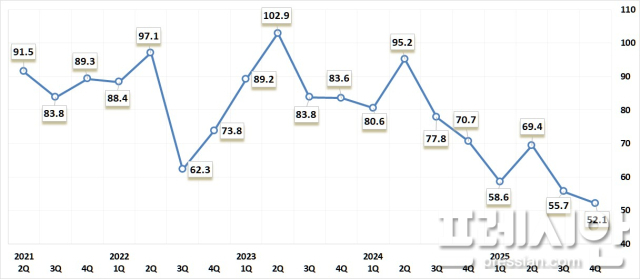 조사 결과 2025년 4/4분기 기업경기전망지수(BSI)는 52.1로 전분기(55.7) 대비 3.6 포인트 하락해 부정적 전망이 더욱 짙어진 것으로 나타났다.