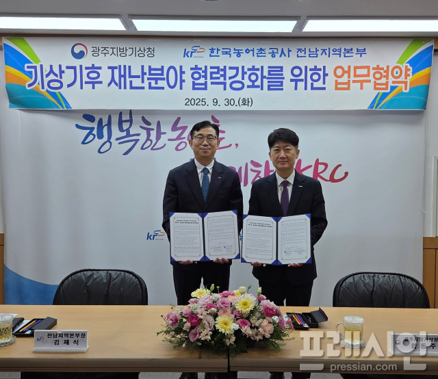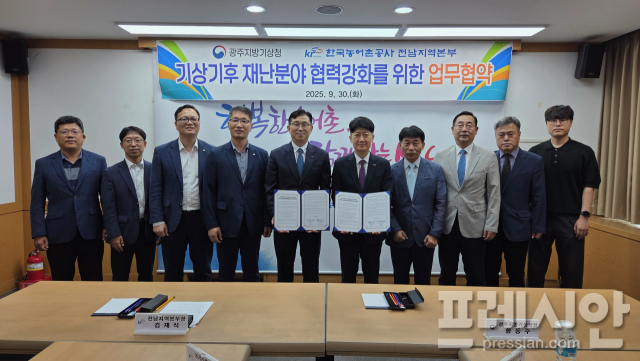 한국농어촌공사 전남지역본부(본부장 김재식)와 광주지방기상청(청장 함동주)이 기후변화로 인한 극한 기상 재해에 공동 대응하기 위해 협력체계를 강화한다. 양 기관은 30일 업무협약(MOU)을 체결하고, 농업·농촌 분야 재해 피해 최소화를 위한 협업에 나섰다.