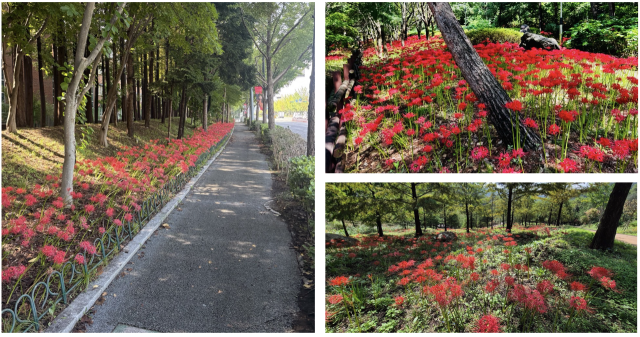 ▲ 대전시가 꽃무릇 명소 5곳을 공개했다. 왼쪽 월평역 산책로, 오른쪽 위 가오동 근린공원, 오른쪽 아래 중구 무수동 치유의 숲. ⓒ대전시