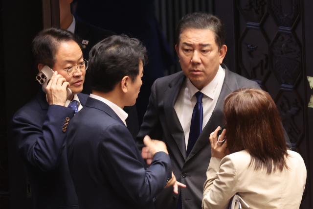▲더불어민주당 김병기 원내대표와 문진석·허영 원내수석부대표가 지난달 25일 서울 여의도 국회 본회의장에서 정부조직개편안 처리를 위한 본회의 개의를 앞두고 심각한 표정으로 대화하고 있다. ⓒ연합뉴스