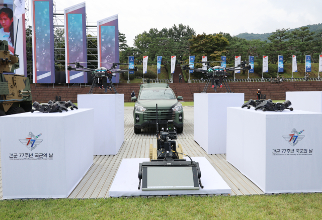 ▲국방부는 건군 77주년을 맞아 국군이 보유한 유·무인 복합체계 신무기를 공개했다. 사진은 지난 29일 국군의날 미디어데이 행사에서 공개된 폭발물 탐지 제거 로봇 등 미래전력제대. ⓒ연합뉴스