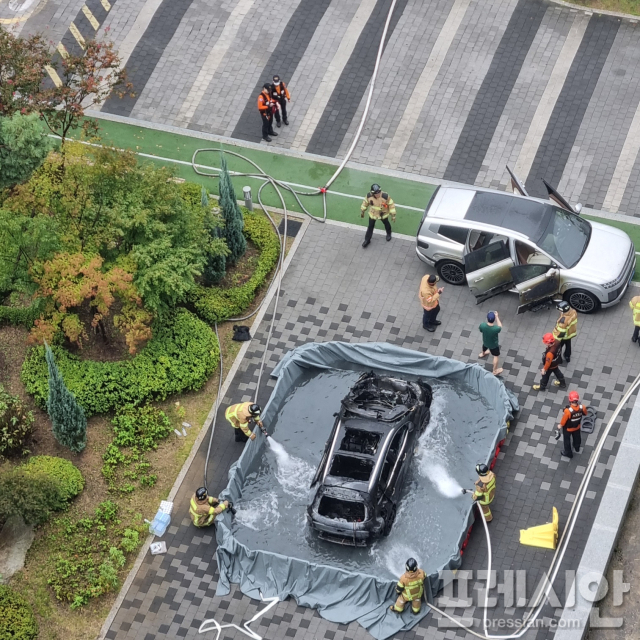추석을 하루 앞둔 5일 경기 수원시의 한 아파트 지하주차장에서 전기차 화재가 발생했다.