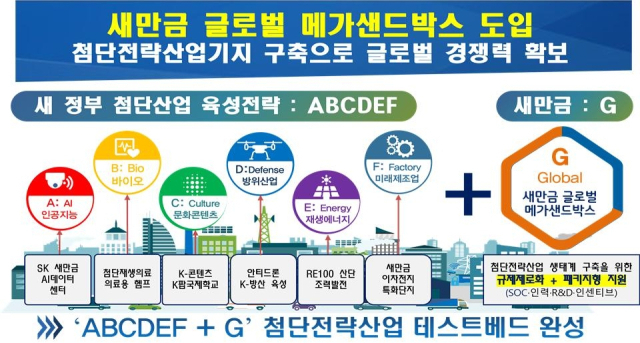 ▲ 전북도가 제시한 ‘ABCDEF+G’ 새만금 첨단전략산업 테스트베드 구상도. AI·바이오·방산·재생에너지 등 6대 산업 전략에 글로벌 메가샌드박스를 결합해 규제 완화와 산업 생태계 조성을 추진한다. ⓒ전북도