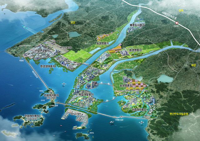 ▲새만금 개발 조감도. 산업·연구, 농생명, 관광·레저 등 6개 권역으로 구분돼 단계별 개발이 추진되고 있다. ⓒ새만금개발청