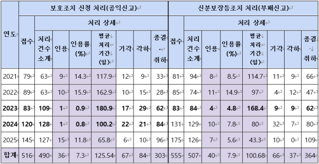 ▲ 2021년 1월~2025년 7월 공익신고자 보호조치 및 부패신고자 신분보장 등 조치 처리 현황 ⓒ참여연대