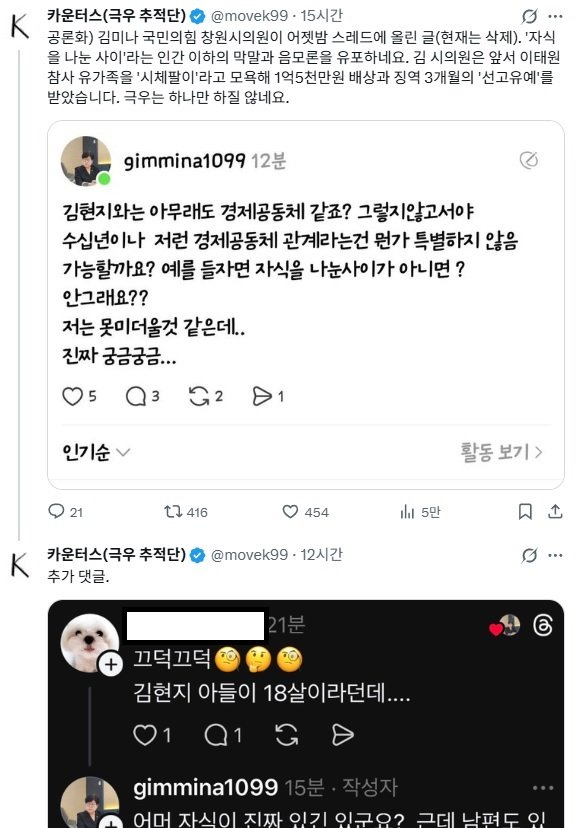 카운터스는 "김미나 국민의힘 창원시의원이 어젯밤 스레드에 올린 글(현재는 삭제)은 '자식을 나눈 사이'라는 인간 이하의 막말과 음모론을 유포한다"며 "김 시의원은 앞서 이태원 참사 유가족을 '시체팔이'라고 모욕해 1억4300만 원 배상과 징역 3개월의 '선고유예'를 받았다. 극우는 하나만 하질 않네요"라고 지적했다.