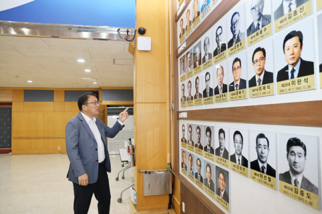 ▲장금용 창원특례시장 권한대행이 역대 창원시장 사진을 보고 있다. ⓒ창원특례시