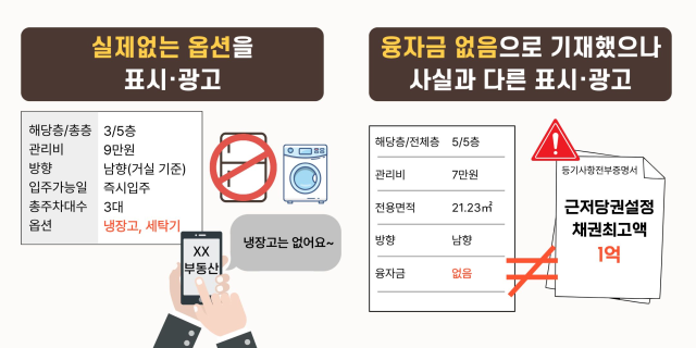 이 가운데 전체 사례의 절반을 넘는 166건은 가격이나 면적, 융자금 등을 실제와 다르게 기재한 것으로 나타났다. 존재하지 않는 냉장고 등이 있다고 기재한 사례도 확인됐다. 계약이 체결되었음에도 표시나 광고 삭제를 지연하는 경우 등도 있었다.