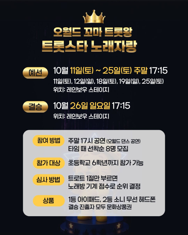대전오월드가 가을 특별프로그램 ‘오월드 꼬마 트롯왕 트롯스타!’ 노래자랑을 개최한다.