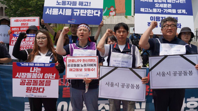 ▲공공운수노조가 2024년 6월 10일 서울시의회 앞에서 서울시사회서비스원 해산 중단 촉구 릴레이 동조단식을 선언하며 기자회견을 열고 있다. ⓒ공공운수노조