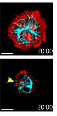 ▲그림1 위 그림에서 붉은 색은 액틴이고, 푸른 색은 미세소관이다. 위 그림은 보통 생쥐이고, 아래 그림은 CD99 단백질이 안 만들어진 T세포 내부를 촬영한 거다. 일반 생쥐의 T세포에서는 종양세포를 보면 액틴과 미세소관의 재구조화가 빠르게 일어나나, 아래 그림에서 보듯 CD99가 없으면 재구조화가 잘 일어나지 않는다. ⓒ최은영