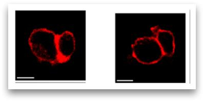 ▲그림3 면역시냅스가 생기는 정도를 나타내는 사진. 원 모양 두 개 중에서 큰 원이 종양세포, 조금 작은 원이 T세다. 왼쪽 사진은 일반 쥐이고, T세포가 종양세포와 결합해 면역 시냅스를 단단하게 형성했다. 오른쪽은 T세포에 CD99 유전자가 없는 생쥐 사진. 이 경우에는 T세포가 종양세포를 공격하기 위해 면역시냅스를 활발하게 만들지 못한다. 두 세포의 밀착 부위에 면역시냅스가 약하게 형성되어 있다. ⓒ이미지 최은영 교수 제공