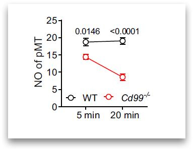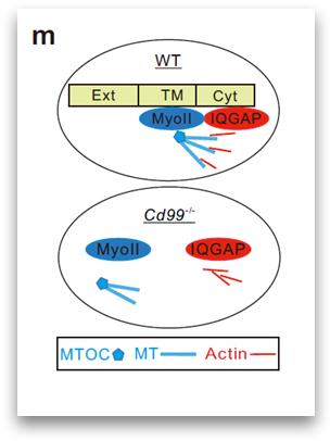 CD99단백질이 없으면 액틴과 미세소관 사이에 상호작용이 없다. 물리적으로 분리되어 있다. 반면에 정상적인 생쥐 T세포 내부에서는 상호작용이 있다. 면역 시냅스가 잘 만들어진다. 미세소관은 접착면을 향해 잘 뻗어나가고 액틴은 섬유사를 많이 만들어 종양세포를 꽉 붙잡는다.