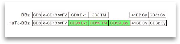 ▲그림 노바티스의 CAR-T치료제 킴리아(위 그림에 BBζ라고 표기)와, 최은영 교수팀이 개발한 CAR-T세포에 링커(HuTJ-BBζ)를 비교한 그림. 세포 밖 도메인(Ext)과 세포막 통과 도메인(TM), 그리고 TM에 접근해 있는 세포 내부 도메인(Jux)에 무슨 물질을 썼느냐를 알 수 있다. 노바티스 제품('BBζ')은 아무 기능을 하지 않는 CD8을 사용하나, 최은영 교수팀은 CD99으로 치환했다. ⓒ이미지 최은영 교수 제공