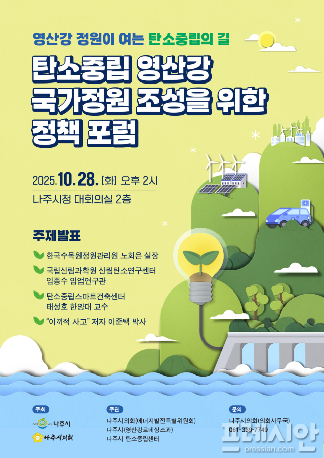 나주시의회(의장 이재남)는 나주시와 함께 오는 28일 나주시청 대회의실에서 '탄소중립 영산강 국가정원 조성을 위한 정책포럼'을 공동 개최한다고 21일 밝혔다.