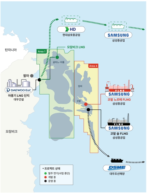 삼성중공업, 현대삼호중공업, 대우조선해양, 대우건설 등은 사업 운용에 핵심이 되는 LNG 운반선 건조, 육상 플랜트 공사 등으로 각 사업에 참여했다. 이 중 삼성중공업의 참여 비중이 가장 크다. 현재 건설 중단 상태인 1광구의 개발 사업과 관련해선 LNG 운반선 8척 건조도 계약을 예정해 뒀다.