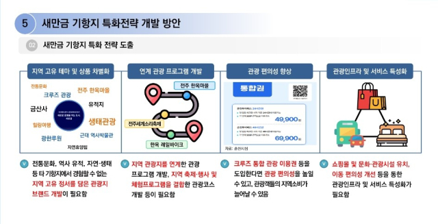 또 새만금 특성을 반영한 관광프로그램 발굴과 새만금 매력도 향상 및 국내 기항지 협력방안 마련 등 관광·마케팅 전략도 필요한 것으로 분석됐다.