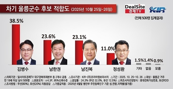 29일 영남이코노믹, 딜사이트경제TV 대구경북취재본부가 공동으로 여론조사 전문기관인 코리아정보리서치에 의뢰한 울릉군수 지지도 조사 결과 자료에 따르면 김병수 전 울릉군수가 38.5%로 1위를 기록했다. 이어 남한권 현 울릉군수 23.6%, 남진복 경북도의원 23.1%, 정성환 전 울릉군의회 의장 11.0% 순으로 나타났다.