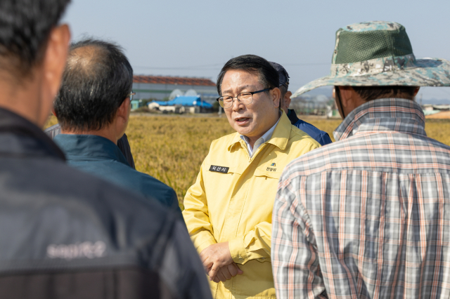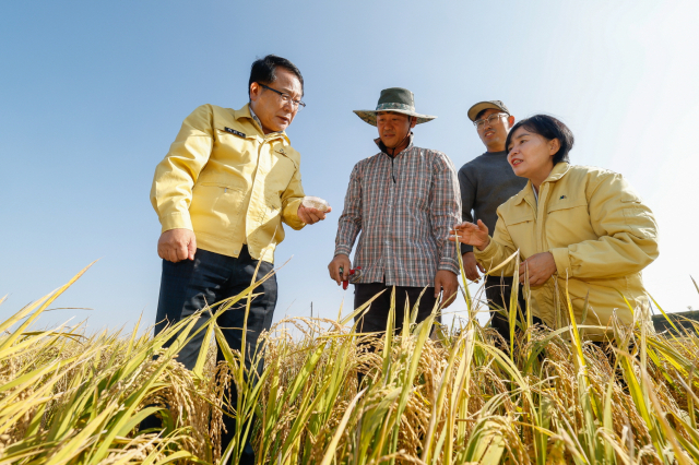정헌율 시장은 29일 오후 오산면 신지리 일원에서 벼 수발아 피해 현장행정에 나섰다. 정헌율 시장은 이날 안성환 우리밀영농조합법인 대표의 농가 포장을 방문해 피해 벼를 직접 살펴보고 농가의 애로사항을 청취했다.