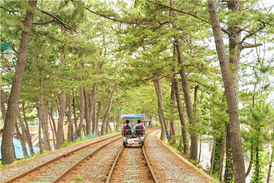삼척해양레일바이크는 일제강점기에 건설을 시작했다가 중단된 철로를 활용해 근덕면 궁촌리에서 용화리까지 5.4km 구간을 복선으로 운행하고 있다.