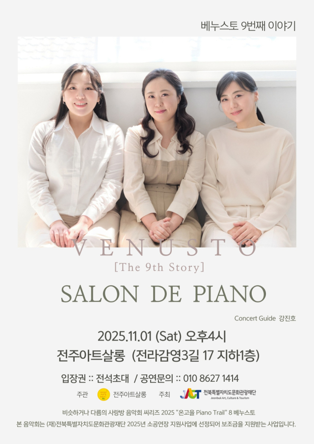 전북특별자치도문화관광재단(대표이사 이경윤, 이하 재단)은 재단이 지원하는 ‘2025 소공연장 지원사업’에 선정된 전주아트살롱의 ‘2025 온고을 피아노 Trail’시리즈가 11월, 3번의 공연을 끝으로 10회 공연 대장정의 막을 내릴 예정이라고 30일 밝혔다.