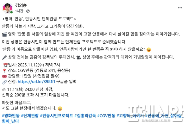 이어 30일에는 ‘영화 〈안동〉, 안동시민 단체 관람 프로젝트’라는 제목으로 또 한 차례 홍보 글을 올리며, 실제 단체관람 행사를 추진하고 있다고 밝혔다.