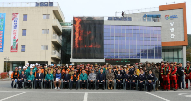 주천면 소재 코이카글로벌인재교육원에서 실시된 이번 훈련은 전기차 화재로 인한 대형 건물 화재가 발생하여 산불로 확산하는 상황을 가정해 민·관·군 협력체계를 점검하고 재난대응 역량을 강화하기 위해 실시했다.