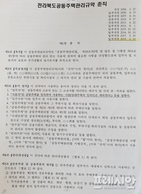 이와 관련 프레시안이 입수한 모 위탁관리업체의 관리규약에 따르면 전북자치도 공동주택 관리규약 준칙과는 달리 제62조의 4 ‘용역 금액의 사후정산’의 내용이 삭제되어 있다.
