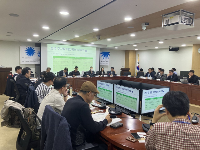 7일 오후 서울 여의도 국회에서 환경운동연합, 시민발전이종협동조합연합회, 공공재생에너지연대 등 주관으로 '모두를 위한 공영주차장 태양광 의무화 지원조례 제정 토론회'가 열렸다. 이들은 "주차장과 태양광 에너지 둘 다 공유재이기에, 이것을 활용한 이익은 주민들에게 돌아가야 한다"고 주장했다.