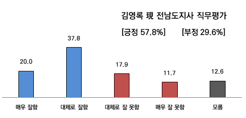 조사 결과 김영록 지사의 전반적인 직무수행에 대한 긍정평가는 57.8%를 보이며, 부정평가 29.6% 보다 28.2%p 높았다. 매우 잘함 20.0%, 대체로 잘함 37.8%였고, 부정평가는 대체로 잘못함 17.9%, 매우 잘 못함 11.7%로 집계됐다. 모름은 12.6%였다.