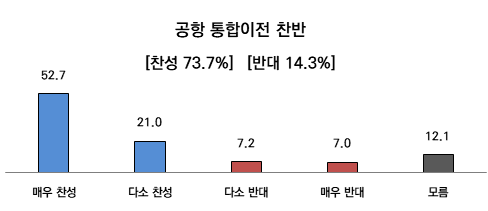 광주 군 공항과 민간 공항을 무안국제공항으로 통합 이전하는 방안에 대해 찬성은 73.7%로 나타나 반대 응답 14.3% 보다 59.4%p 높았다.
