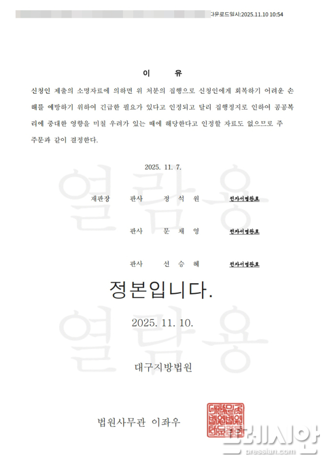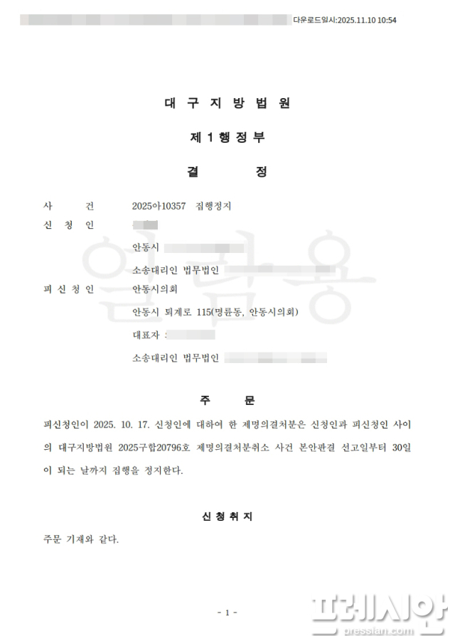 대구지방법원 제1행정부(재판장 정석원)는 7일, A 의원이 안동시의회를 상대로 낸 집행정지 신청(2025아10357)에 대해 “신청인 제출의 소명자료에 의하면 위 처분의 집행으로 신청인에게 회복하기 어려운 손해를 예방하기 위하여 긴급한 필요가 인정되고 달리 집행정지로 인하여 공공복리에 중대한 영향을 미칠 우려가 있는 때에 해당한다고 인정할 자료도 없으므로 주문과 같이 결정 한다”며 집행정지 결정을 내렸다.