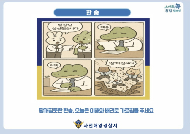 경남 사천해양경찰서는 12일 직원들이 쉽게 공감할 수 있는 청렴 문화 확산을 위해 '스마트海 청렴 4컷 카툰북'을 제작·발간했다고 밝혔다.