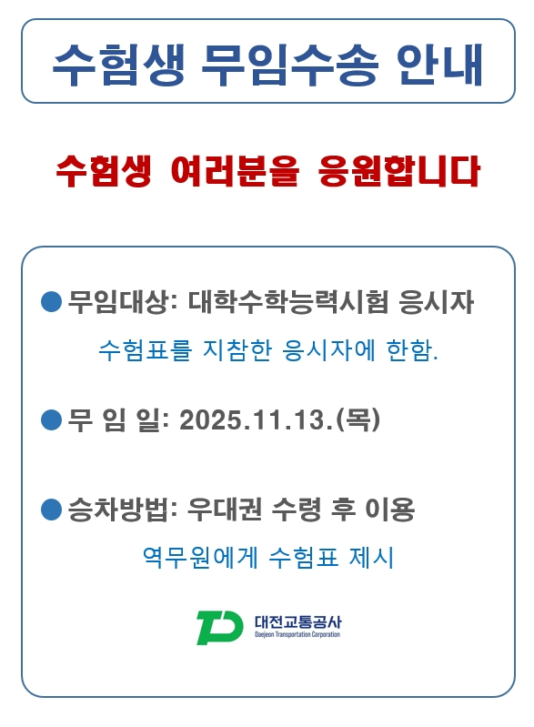 대전교통공사가 오는 13일 2026학년도 대학수학능력시험당일 수험생의 원활한 이동을 위해 무임수송과 특별안전수송대책을 시행한다.