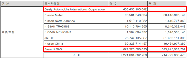 사명만 바뀐 게 아니라 중국의 지리(Geely) 자동차가 2대 주주로 들어오는 변화가 생겼기 때문이다. 르노 브랜드를 달고 있지만 사실상 지리의 플랫폼을 활용해 출시된 그랑콜레오스, 이 차량에 장착되는 부품 상당수를 지리에서 수입해오고 있다. (아래 2024년 르노코리아 감사보고서 참조)