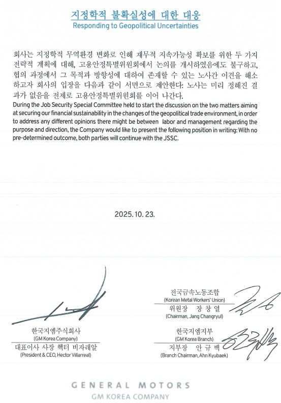 최근 한국 정부는 트럼프 행정부와 기나긴 협상 끝에 대미 상호관세와 자동차관세를 25%에서 15%로 내리는 합의가 이뤄졌다. 한국 생산량의 90% 가까이를 미국으로 수출하는 한국지엠은 안도의 한숨을 쉬었을까? 천만의 말씀! 경주 APEC 회의에서 합의가 이뤄진 지 열흘도 지나지 않아 GM은 내년 2월에 한국 직영정비사업소를 모두 폐쇄하겠다며 노동조합과 정부에 일방적으로 통보했다.