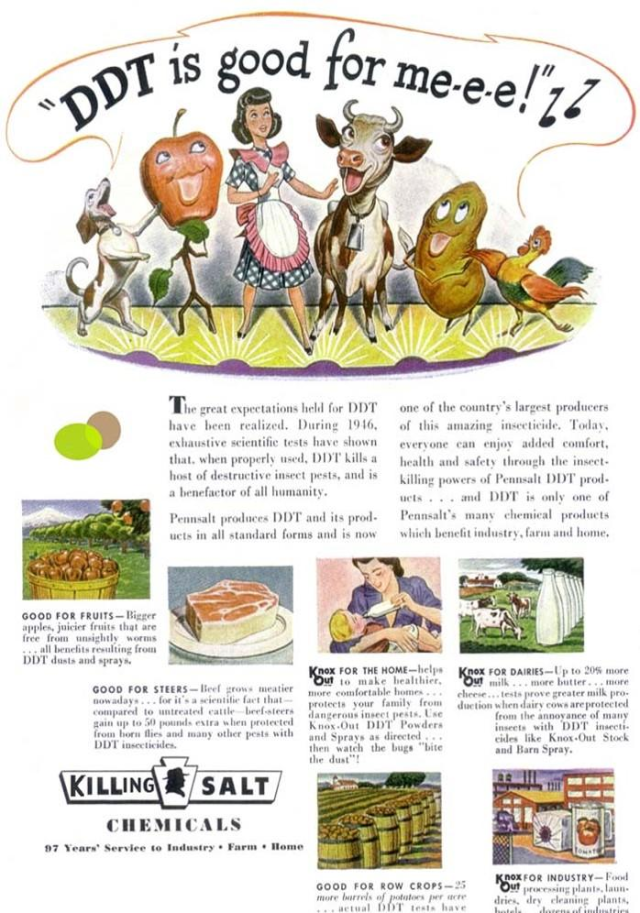 1945년부터 1960년대 중반까지 혁신적 살충제로 홍보되며 농업·방역을 넘어 가정에까지 판매된 DDT가 대표적인 사례이다. 레이첼 카슨이 DDT의 해악을 경고하는 <침묵의 봄>을 썼을 때, 화학기업은 과학적 근거가 없고 감성적 과장이라고 비판했다. 나아가 방역과 농업과 식량 안보를 위협한다고도 공격했다.