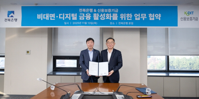 JB금융그룹 전북은행(은행장 백종일)은 신용보증기금과 함께 중소기업 및 소상공인 지원 강화를 위한 '비대면·디지털 금융 활성화 업무협약(MOU)'을 체결했다고 13일 밝혔다.