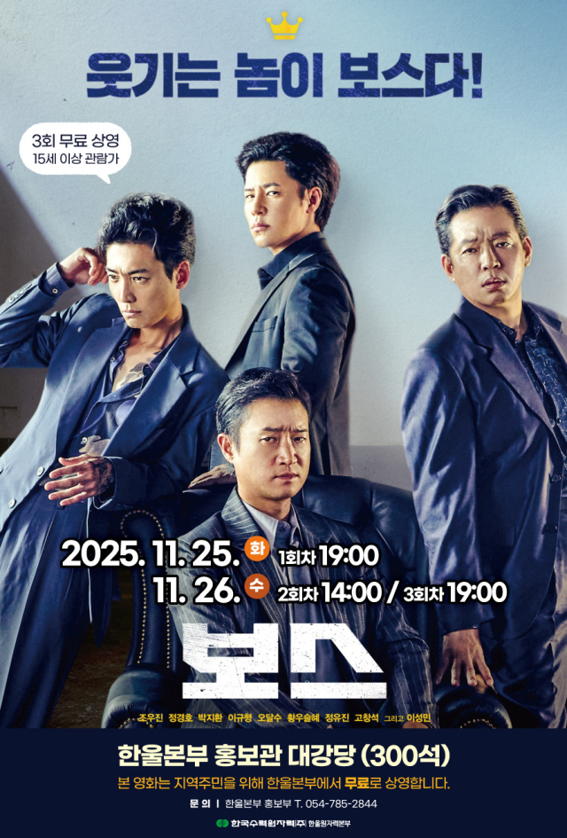 한울원자력본부( 이하 한울본부)는 지역주민을 대상으로 오는 25일, 26일 이틀간 한울에너지팜 대강당에서 영화‘보스’를 무료 상영한다.