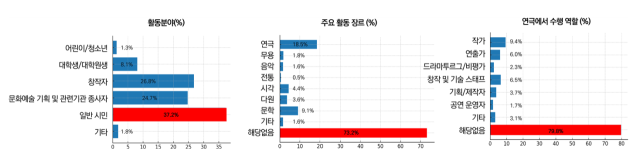 지난해 서울문화재단이 진행한 <연극in> 설문조사를 살펴보면, 설문에 응한 70~80%가 '주요활동장르' 및 '연극에서의 수행 역할'에 '해당 없음'으로 표기했다. 이는 자신을 특정한 분야 예술가나 연극 분야 종사자로 정의할 수 없다는 의미다. 직접적으로 직업을 묻는 문항에도 일반시민으로 답한 비율이 37.2%이다. 나머지 항목인 학생, 창작자, 문화예술 관련기관 종사자 중에 가장 높은 수치다.