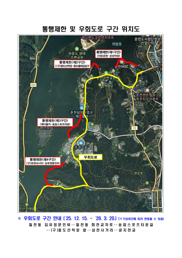 자전거도로 통제구간은 △의암공원 야외공연장 입구~KT&G 상상마당춘천 인근(0.45㎞) △삼천동 구)중도선착장 앞~중도물레길 입구(0.37㎞) △삼천 낚시터 입구~송암동 수상협회 입구(0.8㎞) △송암스포츠타운~김유정문인비(1㎞) 등 4곳이다. 시는 자전거와 개인형 이동장치(PM)의 겨울철 미끄럼 사고가 빈번하게 발생하는 점을 고려해 해당 조치를 마련했다.