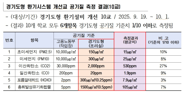 도교육청은 이 밖에도 지난 9월 대한산업보건협회와 경기도형 환기 개선을 완료한 10개 교를 대상으로 효과성을 검증하기 위한 공기질 측정을 의뢰한 결과, 10곳 모두 6개 항목에서 경기도형 공기질 기준치의 1/10 이하로 측정돼 경기도형 환기설비의 효과성도 입증됐다고 설명했다.
