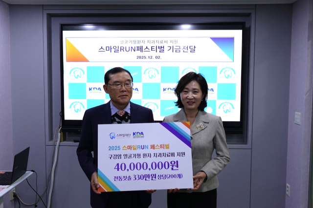 대한치과의사협회(회장 직무대행 마경화, 이하 치협)가 ‘2025 스마일 런 페스티벌’ 수익금 4천만 원과 전동칫솔 200개를 지난 12월 2일 스마일재단에 전달했다. 기금 전달식에는 치협의 장소희 부회장과 조은영 문화복지 이사, 스마일재단의 이수구 이사장과 관계자들이 참석했다. 치협은 올해 행사 수익금 5천만 원 중 4천만 원을 기부했으며, 나머지 1천만 원은 창립 100주년을 기념해 별도 기부를 추진 중이다.
