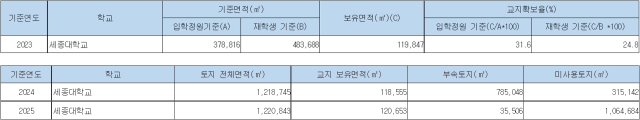 이 정도만 해도 교육부가 세종대학교 종합감사를 할 이유는 충분하다고 생각한다. 1983년부터 차곡차곡 사서 모은 땅이 40년이 지나서도 '미사용토지'로 남아 있는데 그것도 한두 평도 아니고 무려 120만 제곱미터다. 세종대학교의 대학알리미 웹사이트 교지확보 현황 2023년, 2024년, 2025년 자료만 봐도 이상한 점이 한두 가지가 아니다.