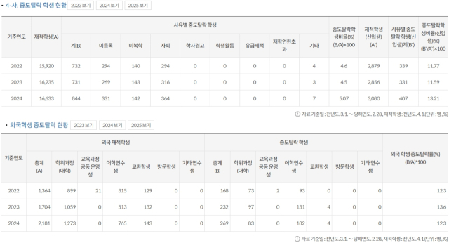 외국인 학생 중도탈락률도 이와 비슷하거나 약간 높다. 지난 3년간 대략 13~14%선을 유지하고 있다. 외국인 유학생 숫자가 1200명에서 1700명까지 해마다 늘거나 줄지만 매년 200명 이상 학교를 떠난다. 통계를 보면 어학연수 등의 비학위과정 학생이 절반 이상이지만 학위과정, 즉 대학 수업을 듣다가 학교를 떠나는 외국인 유학생도 매년 100명 가까이 된다. 한국인이나 외국인이나 공통적으로 100명 중에서 12~13명이 매년 이 학교 더는 못 다니겠다고 결정하고 그만두고 나가버린다. 무엇이 문제일까? 한국인과 외국인을 합쳐서 매년 전체 재학생 10명 중에서 1명 이상이 떠난다면 적은 숫자는 아니다.