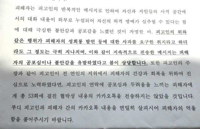 "피고인이 전 연인의 지위에서 피해자의 건강과 회복을 위해 진심으로 노력했다면, 피고인의 연락에 공포심과 두려움을 느끼는 피해자에게 총 53회에 걸친 협박성 내용의 카카오톡을 전송하지는 않았을 것입니다. 부디 피고인과 피해 간의 카카오톡 내용을 면밀히 살피시어 피해자의 억울함을 풀어주시기 바랍니다."
