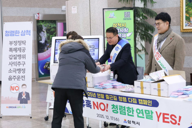 삼척시는 연말을 맞아 공직사회의 청렴 실천 의지를 다시 한번 다지고, 건전한 공직문화를 확산하기 위해 17일 출근길 반부패·청렴 캠페인을 실시했다.