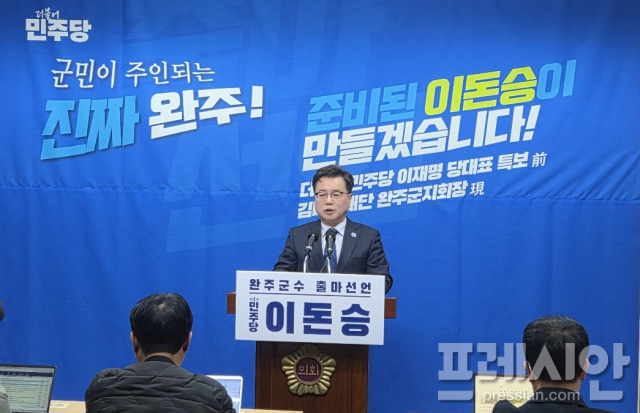 이돈승 전 더불어민주당 당대표 특보가 18일 완주군청과 전북특별자치도의회 브리핑룸에서 기자회견을 열고 민선 9기 완주군수 선거 출마를 공식 선언했다.