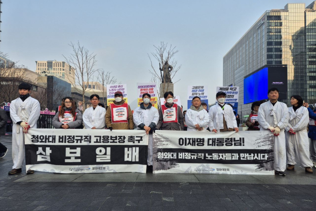 공공운수노조 서울지역지부 청와대분회는 29일 서울 종로 광화문광장에서 삼보일배 돌입 기자회견을 열고 "청와대에 봉황기가 걸리고 이 대통령도 청와대에서 업무를 시작했지만 청와대 개방 시기 관람, 안내, 시설 운영을 맡은 비정규직 노동자들의 고용보장 대책은 여전히 나오지 않고 있다"며 대책 마련을 촉구했다.
