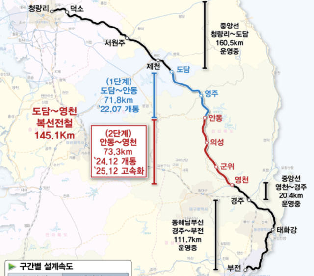 공단은 단계별 개통을 추진해 왔으며 이번 고속화 개통으로 1942년 4월 중앙선 단선 개통 이후 83년 만에 도담∼영천 전 구간 고속화가 완성됐다.